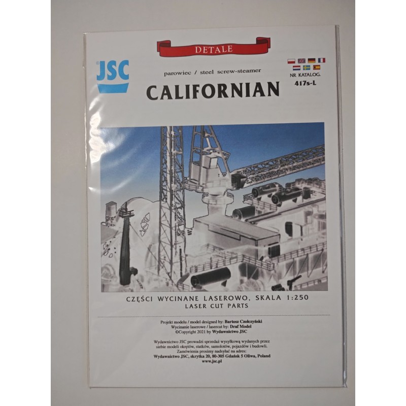 Rescaled paper model. Steamer built in Dundee, used to carry cotton to Great Britain. Californian was involved in Titanic disaster. Sunk in 1916 after being hit by a torpedo.